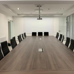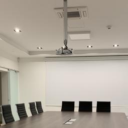 Sejna soba Namestitev: Elektrodvižno projekcijsko platno Adeo 3.500 x 2.275 mm Projektor Stropni nosilec Namizna priključna doza Galerija